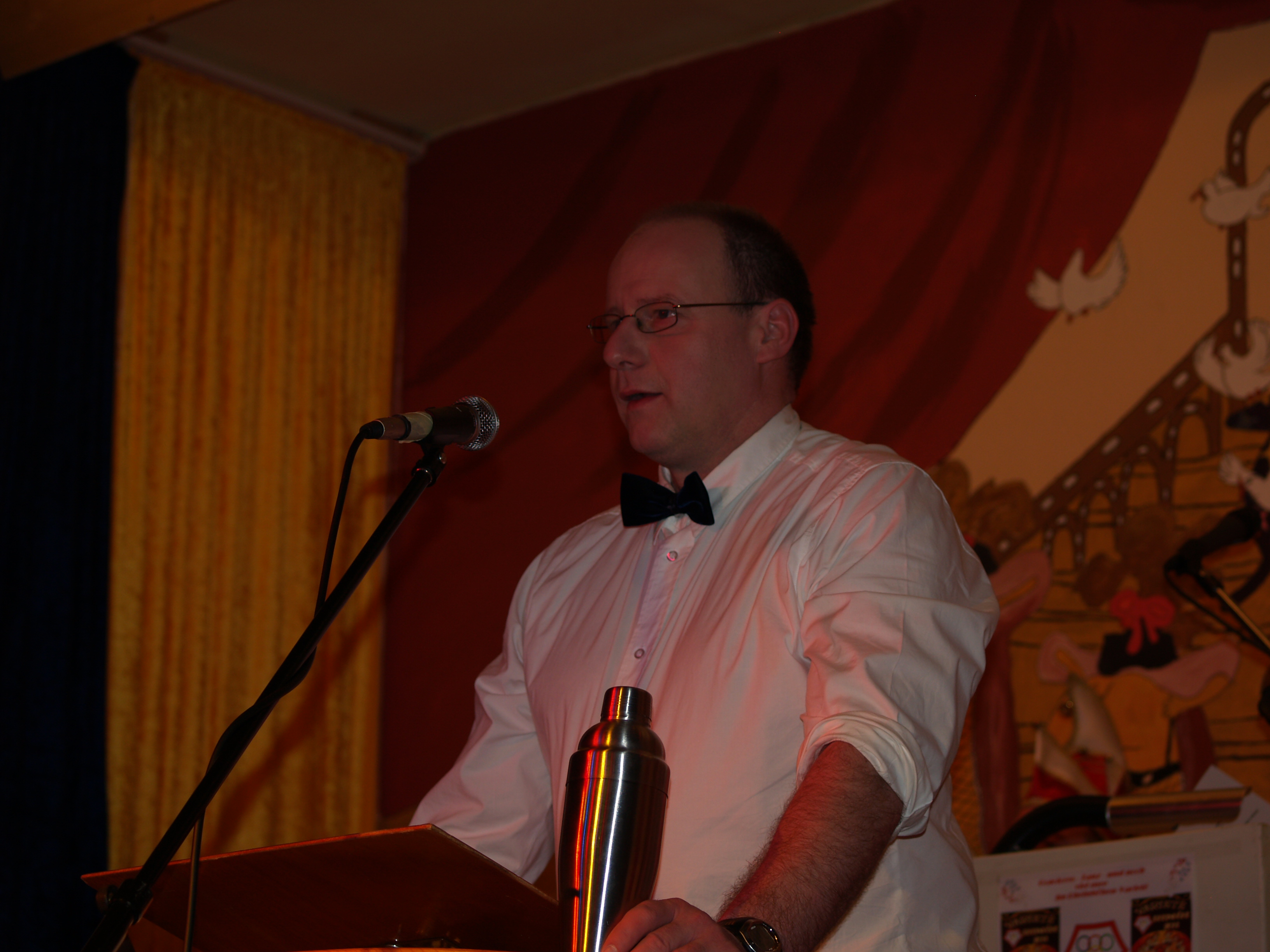 Doch nicht nur das Zwerchfell, auch die Narrenaugen wurden verwöhnt. Auf ein Medley der bekanntesten Lieder von Abba heizten die Highlights die Stimmung weiter an. Einen dampfend heißen Aufguss aus schrägem Witz und passender Komik, lieferten Jens Hüttner und Tobi Hölz, die im Adamskostüm die Bühne betraten , mit ihrem Vortrag „ Mensch ist das heiß" ab. Hoher Besuch klopfte nun an die Tür, die närrische Schaar erhob sich um das Oberweseler Prinzenpaar der KG Goubloch samt Garde zu empfangen. Hochprozentiges servierte Ulli Hastenplug als Barkeeper in der Bütt. Mit Geschichten zwischen Cognac und Pils zeigte er, dass der schönste Platz noch immer an der Theke ist. Im 17. Jahr live auf der Bühne, rissen die Mogweys das Publikum von den Bänken.