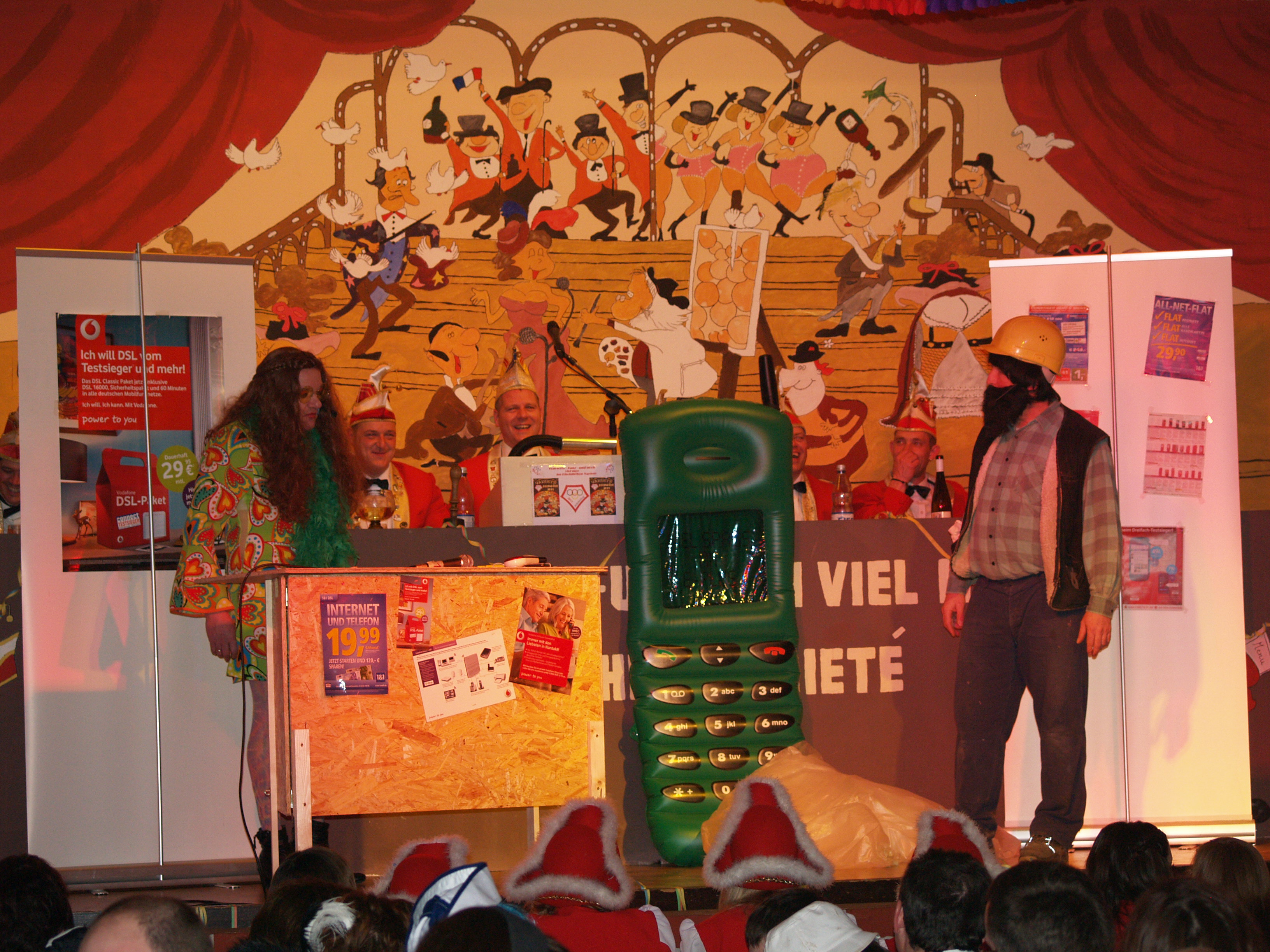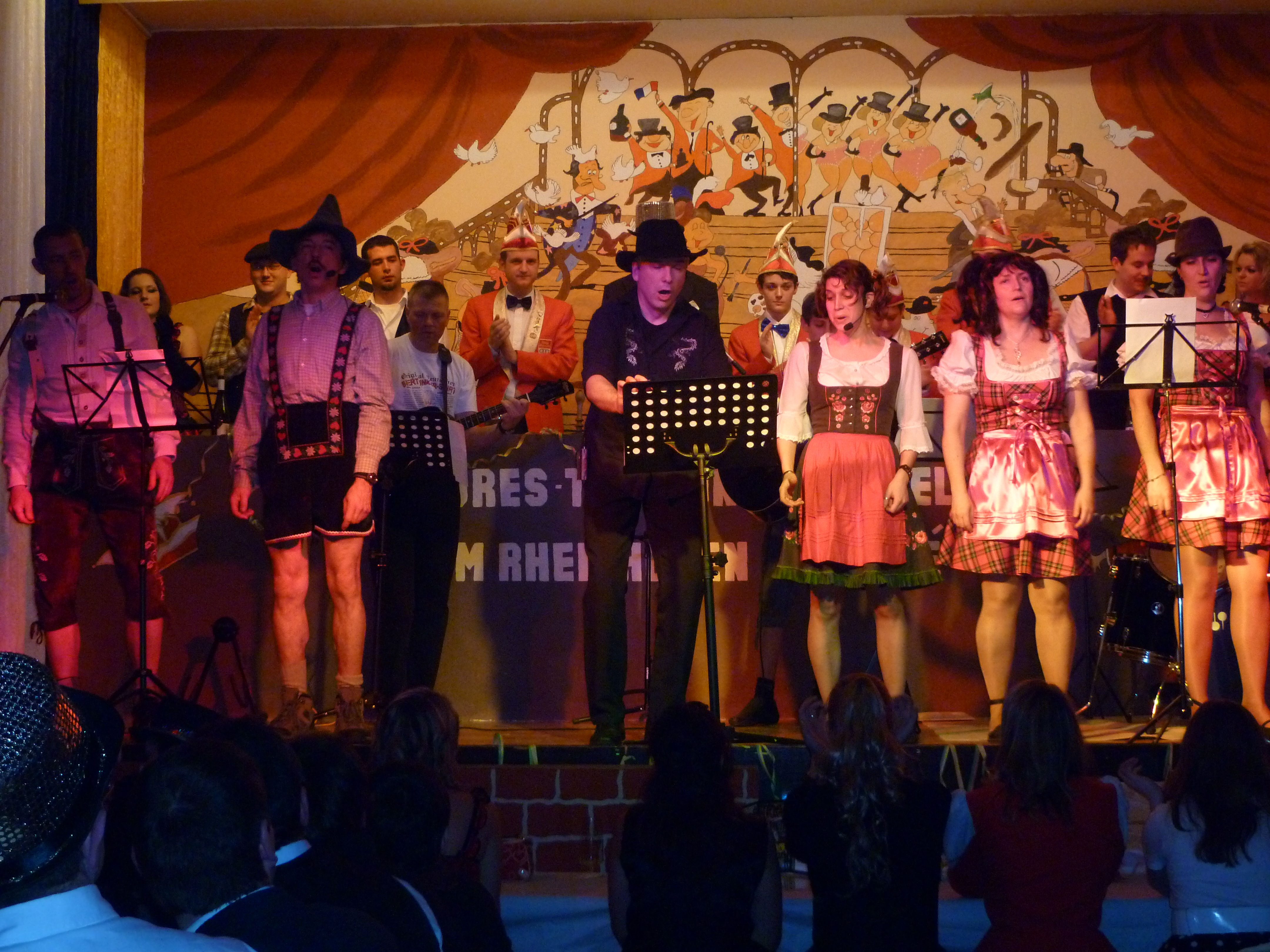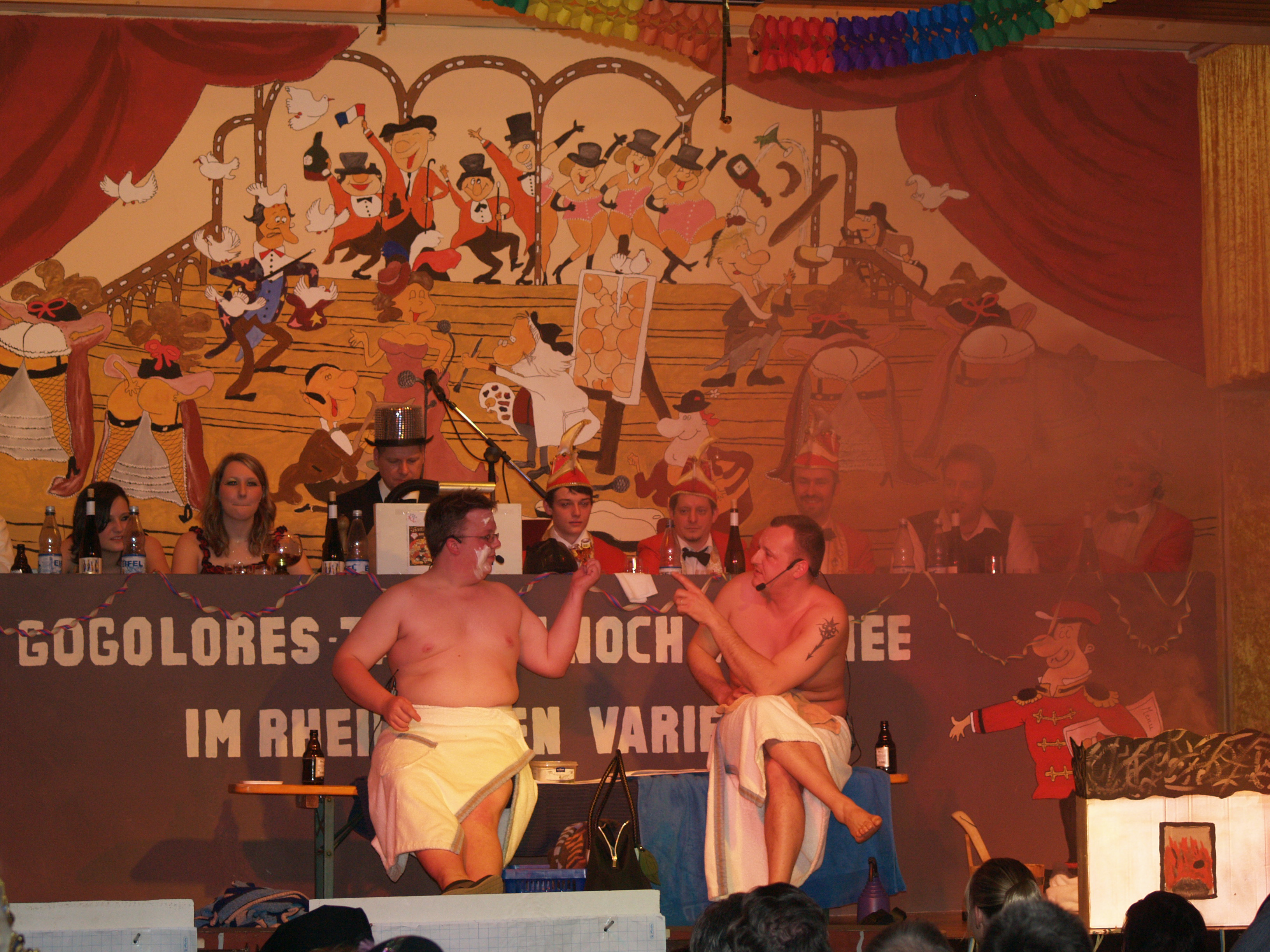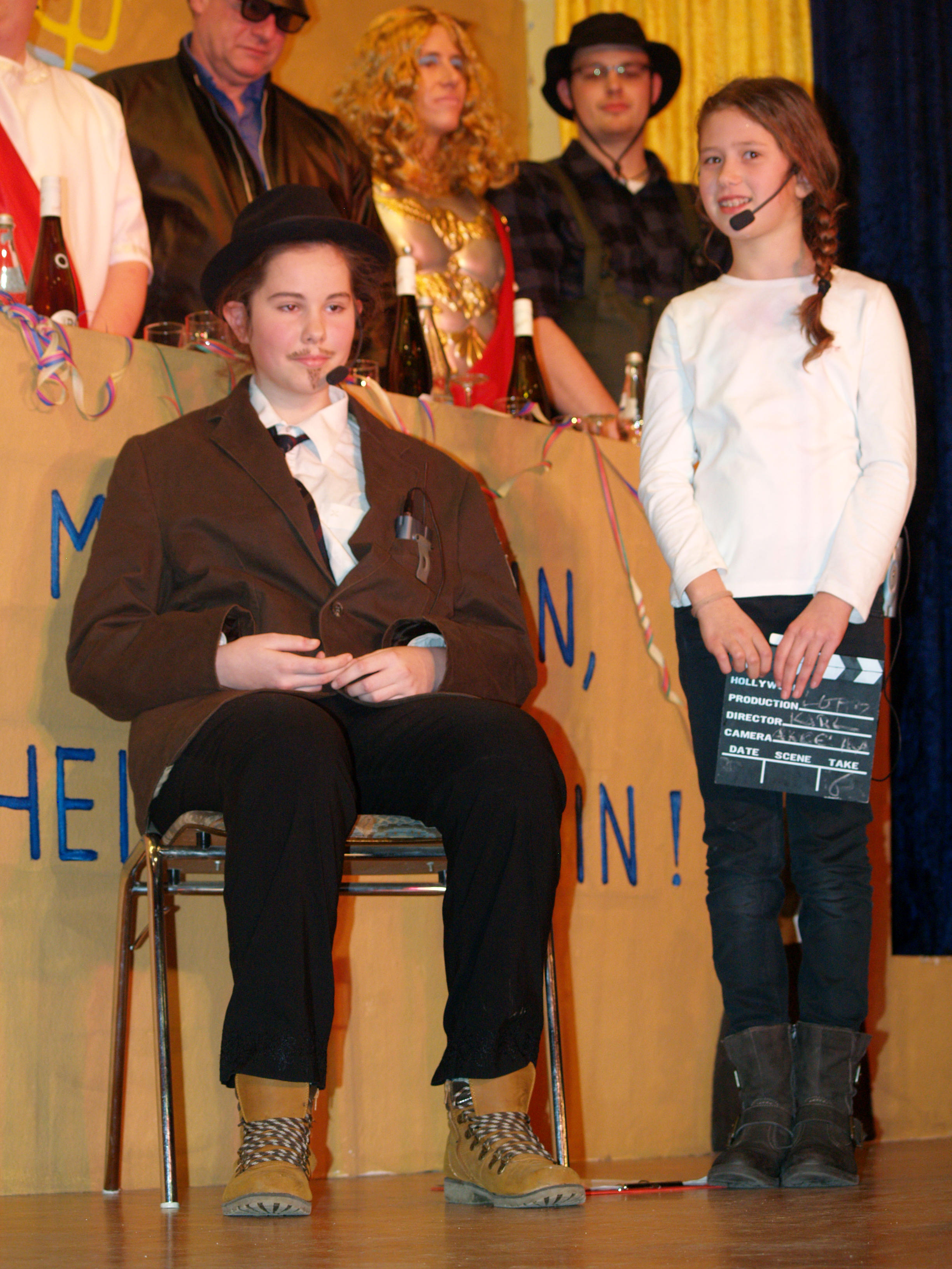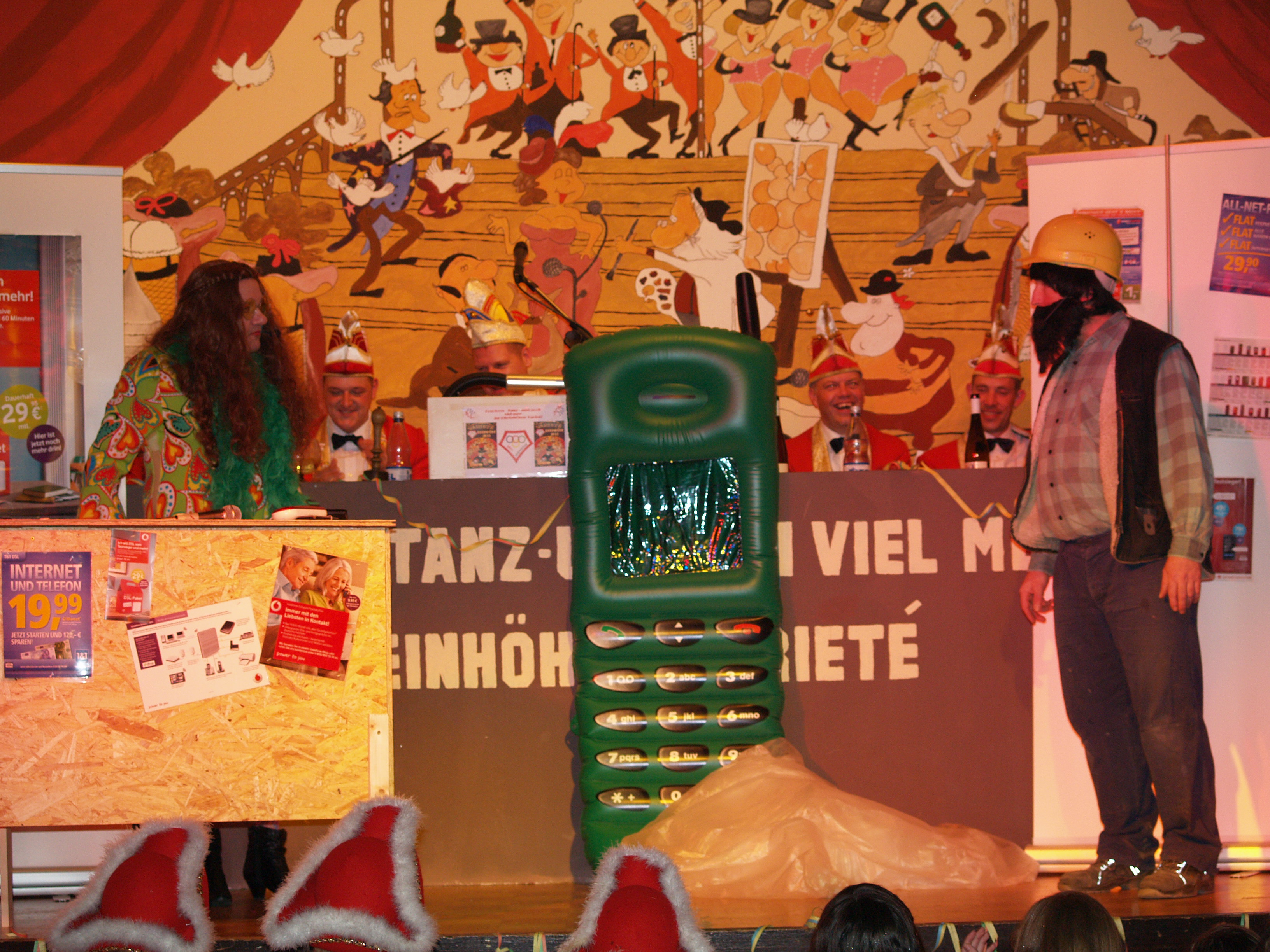 Eine Hommage auf verschiedene Musicals und die Probleme als Darsteller der zweiten Wahl zeigten im "Anschluss die Gruppe der Bleedmänner. Die Darsteller der Musicals „We will rock you" (Roland Dietz), „Sistor Act" (Mark Federhenn), „Starlight Express“ (Patrick Günster) und Cats (Jessica Dietz) ließen ihren Gesangs-, Fahr- und Schauspielkünsten auf der Bühne freien Lauf. Zum ersten Mal im Rampenlicht der Rheinhöhe: Nicklas Hüttner. Als Messdiener unterwegs zeigte er einen Vortag höchster Klasse. Die zwei Gallier Osterix und Abelix (Tobias Hölz und Jens Hüttner) waren eigentlich angetreten, um den Bürgersteig in Perscheid fertigzustellen. Stattdessen gab es außer Hinkelsteinen auch jede Menge Zaubertrank, der mit allerhand schrägem Humor einherging. Im nun folgenden Gardetanz der „Knappe Reggelscher" (Elena Lambrich, Michelle Lambrich, Lucia Lambrich, Theresa Kapell, Raffaela Müller, Maren Mallmann, Patricia Metzenroth) waren gleich zwei Dinge zu bewundern: ein Tanz zu einem Medley von Michal Jackson, trainiert von Steffi Scherschligt, und die neuen Tanzkleider der Damen. Zum Abschluss der ersten Halbzeit betraten zum 19. Mal die Mogweys (Martin Hochstein, Rosi Hochstein, Nadja Denner, Ramon Denner, Jessica Oldach, Uwe Hochstein, Frank Hochstein, Vincent Hastenplug, Robin Dietz) die Bühne.