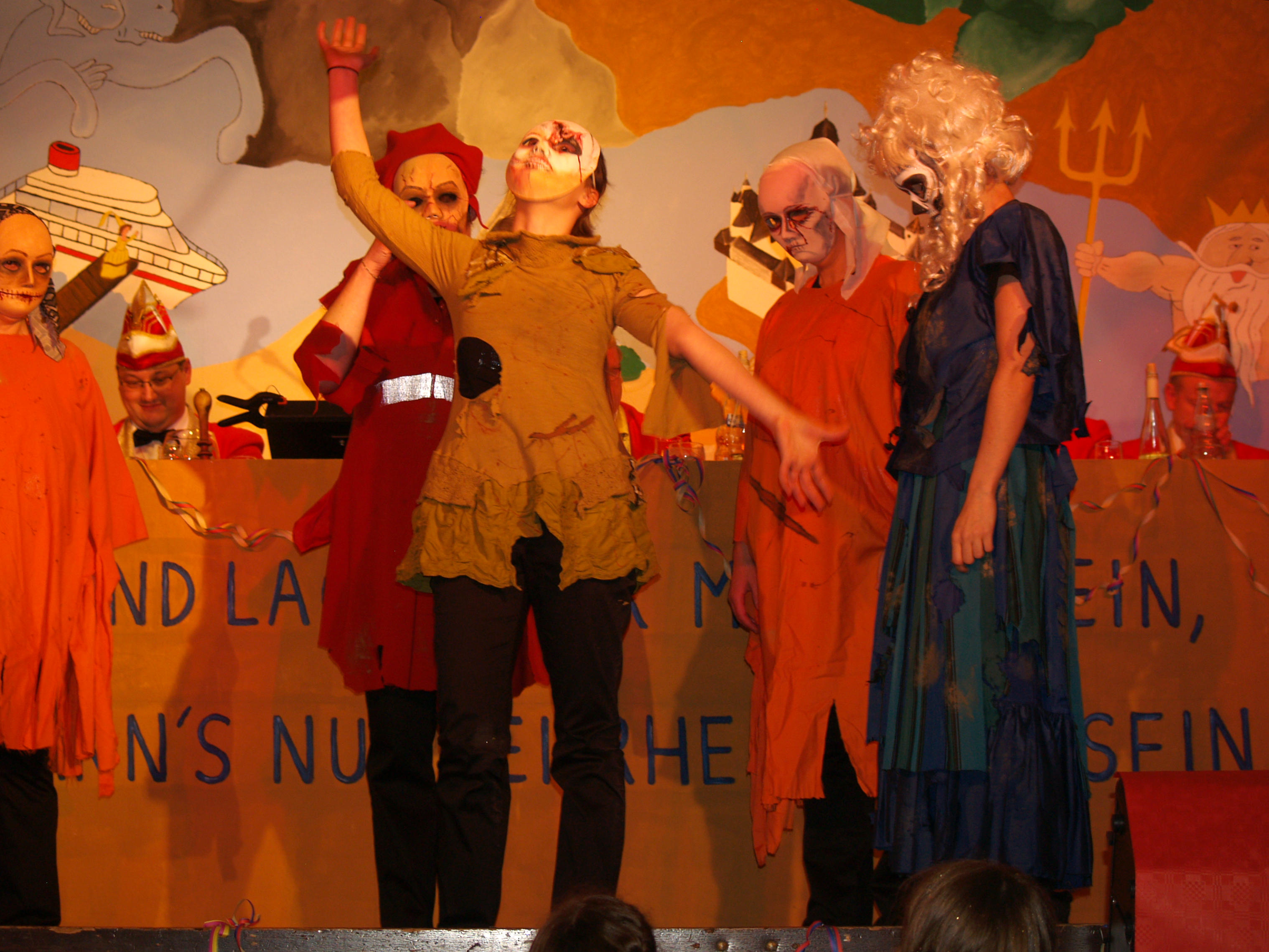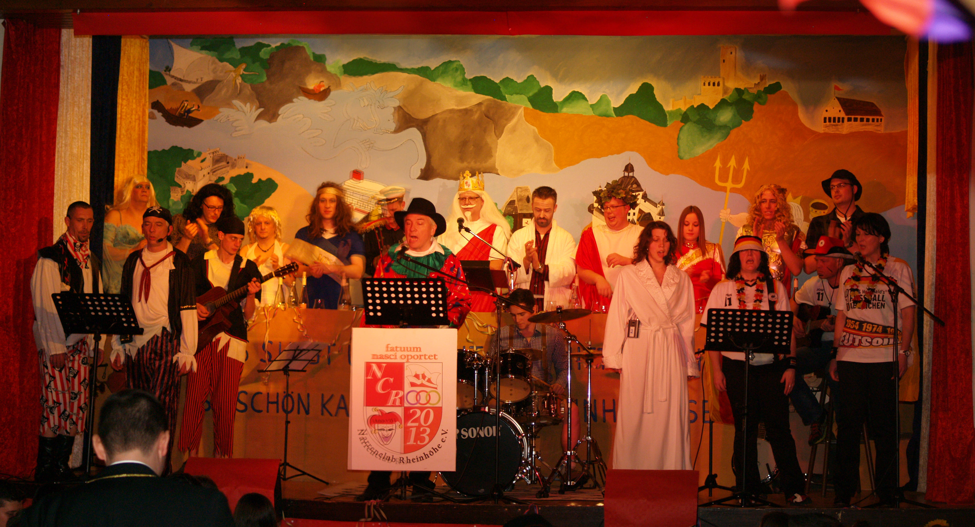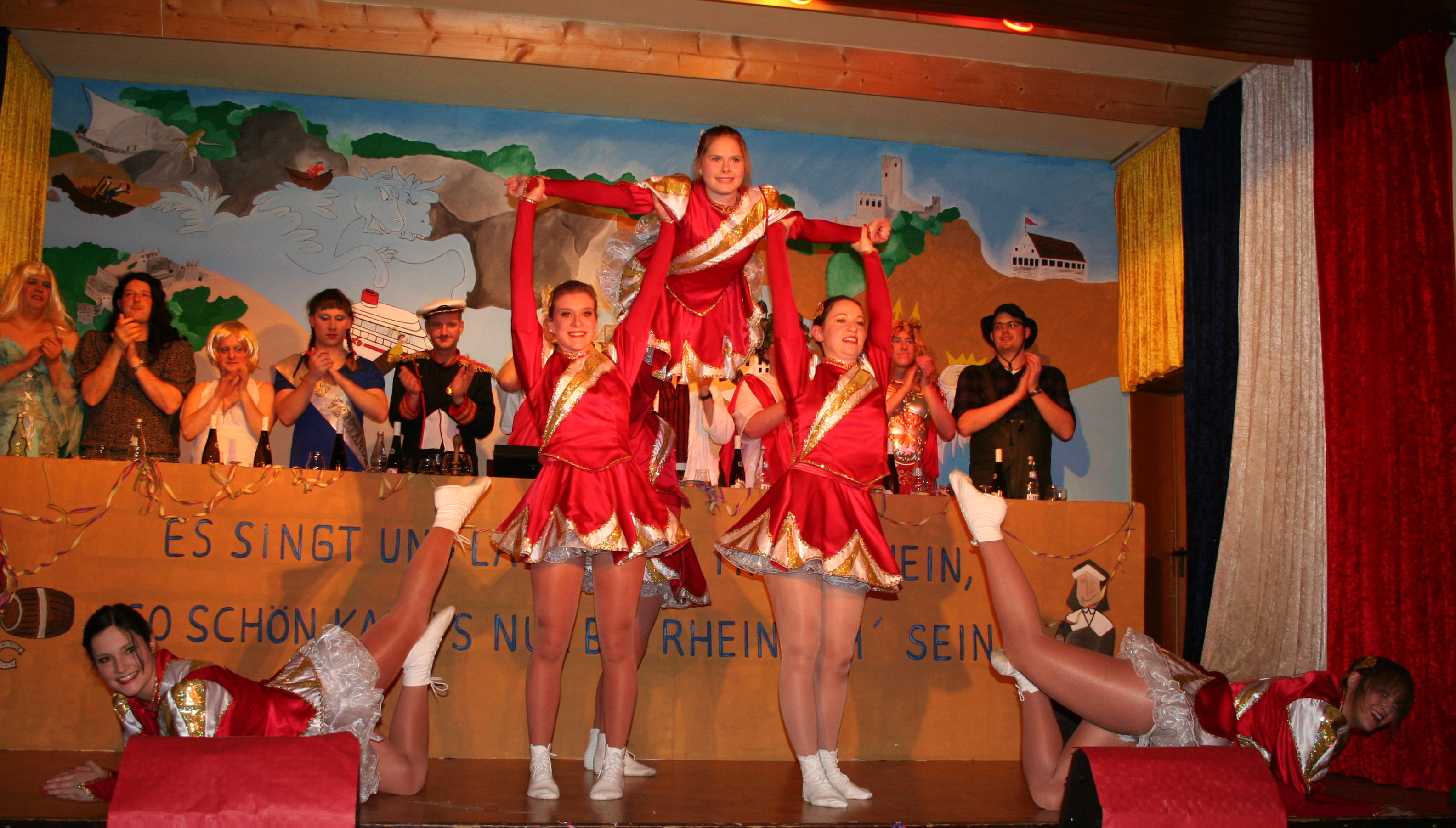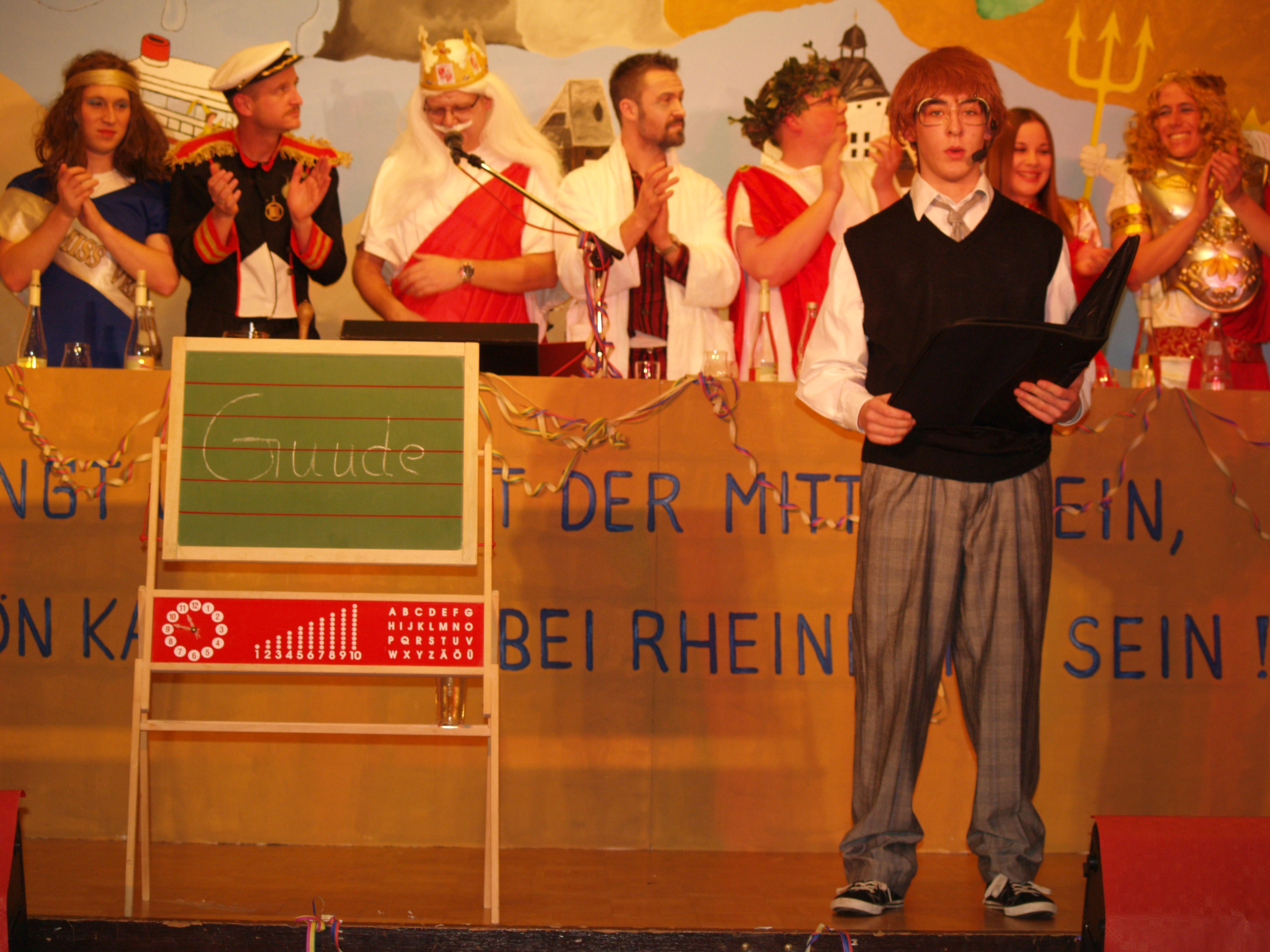 Als Matrose behielt Silke Hüttner den Überblick über das Geschehene im vergangenen Jahr und ließ die Peinlichkeiten der Dörfer rundum noch mal aufleben. Ihr gelungenes Debüt auf der Rheinhöhen-Fassenacht gaben anschließend Lucien Denner, Konstantin Balter und Philipp Schmidt, als sie humorvoll von ihrem Angelsport erzählten. Die Gruppe „EigenART“ zeigte eine neue Art des Showtanzes, die großen Anklang beim Publikum fand. Die Trainerin erarbeitete eine Choreografie zu dem Lied „Closer“ mit abgewandelten Schritten aus dem Film „Footlose“. Als begeisteter Kreuzfahrtreisender packte Uli Hastenplug einige Geschichten aus seinem Koffer, nicht ganz ohne Anspielung auf das Ünglück der „Concordia“. Bei dem Vortrag „Um Götters Willen“ von den .Bleedmännern blieb kein Auge trocken: Fernab von der Unterwasserwelt schauten Apollon (Roland Dietz), Zeus (Mark Federhenn), Hermes (Patrick Günster} und Aphrodite (Jessica Dietz) auf die Erde hinab. Dass man mit dem Weißen Hai auch gut Freund werden kann, bewies das beliebte Duo Jens Hüttner (Taucher) und Tobias Hölz (Weißer Hai) mit seinem Beitrag „Es ist angerichtet“.
