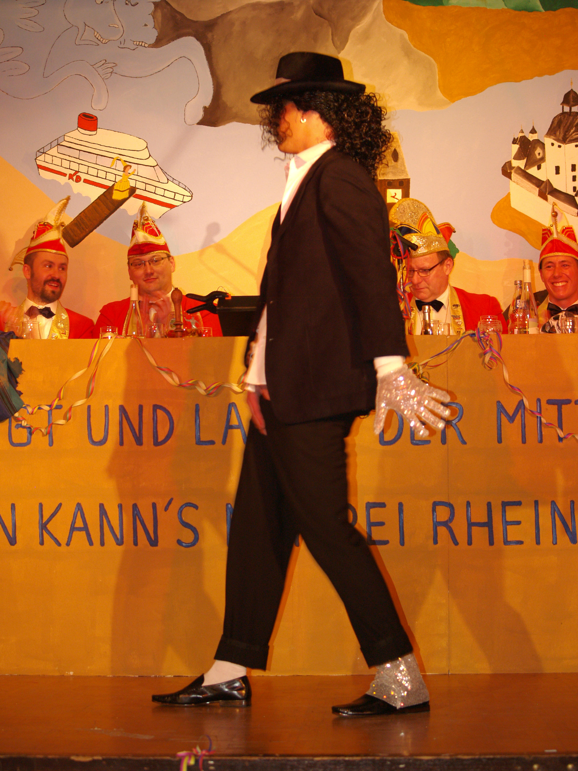 Wild tanzende Störche brachte die Truppe der „Rhäin Birds“ mit Christoph Hastenplug, Dieter Labisch, Frank Hochstein, Steffi Bonn und Maren Mallmann in den Saal. Mit bekannten Songs ließ der Animationsvortrag im Schwarzlicht keinen mehr auf den Stühlen sitzen. Der Schulmeister (Niklas Hüttner) belehrte das Publikum auf lustigste Art und Weise und bewies, dass er mit seinen jungen Jahren schon enorm beliebt bei den Narren ist. Gefolgt von einem Tanz der „Knappe Reggelscher“ in neuer Formation genoss das Publikum den von Maren Mallmann und Raffaela Müller einstudierten Tanz sichtlich. Neben den Trainerinnen selbst tanzten: Theresa Kapell, Friederike Hanß, Soraya Graeff und Patricia Metzenroth. Michelle Sonne war leider wegen Krankheit nicht einsatzfähig. Ein echtes Fastnachtsduo hat sich mit dem ehemaligen 9er-Rat Mitglied Birgit Berres und Ehrensitzungspräsident Ulli Hastenplug gefunden. Als reisendes Ehepaar zeigten sie die Tücken einer langjährigen Ehe in feinster Manier auf. So manches Ehepaar im Saal dürfte sich im humoristischen Beitrag wiedergefunden haben. „Ein Hoch auf uns“, das konnten die Mogweys (Martin & Rosi Hochstein, Nadja & Ramon Denner, Uwe und Frank Hochstein, Jessica Oldach, Vincent Hastenplug und Robin Dietz) nach 21 Jahren Rheinhöhen-Bühne laut schallend singen, bevor es nach zwei zusätzlichen Beiträgen weiter mit „Atemlos durch die Nacht“ ging. Sie sind auf den Kappensitzungen des NCR wie das Salz in der Suppe, also nicht mehr wegzudenken. Atemlos war nach der ernsten Halbzeit auch die Narrenschar, was teils vom Mitsingen aber in erster Linie dem Bühnenprogramm geschuldet war. Nach 2x11 Minuten Pause läutete der Elferrat die zweite Halbzeit ein. Mit einem Michael Jackson Remix wurde die Tanzgruppe „Undergrounds“ (Marie Schmidt, Sophie Oldach, Heidi Straßburger, Nadja Denner, Rosi Hochstein und Jessica Oldach) angekündigt und zeigte mit schnellen Schritten ihr Können, bevor als Highlight Michael Jackson (Johannes Oldach) unter lauten Zurufen der anwesenden Mädels seinen legendären Moonwalk performte.
